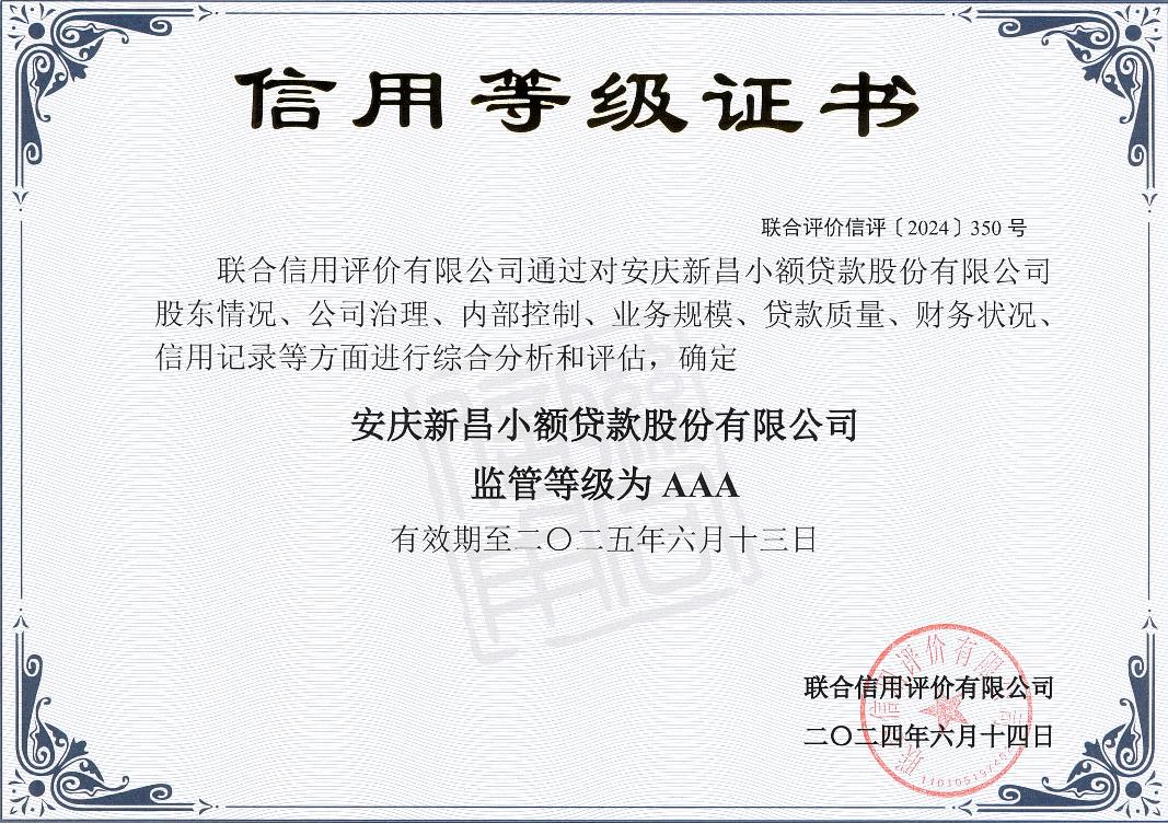 這是新昌小貸連續(xù)五年獲評AAA信用等級,新昌小貸公司也是安慶地區(qū)唯一一家AAA級小貸公司。